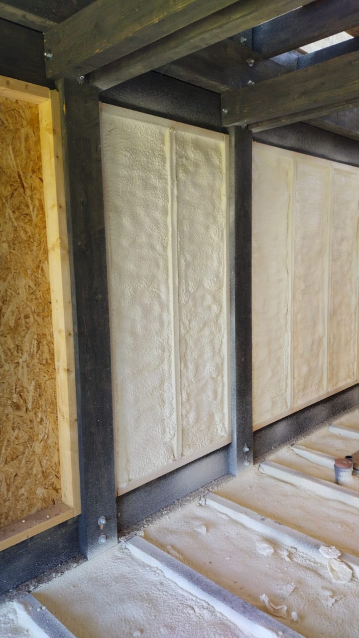 Для напыляемого утеплителя после монтажа деревянного каркаса, производится монтаж ОСБ плит и напыление ППУ, монтаж обрешетки, после чего монтируется элементы фасадной отделки (штукатурные, деревянные, фасадные панели и т.д.). Паро-гидроизоляция, влаго-ветрозащита и контробрешетка не требуется.