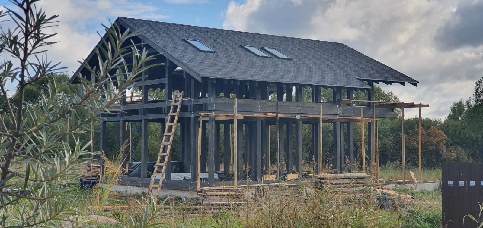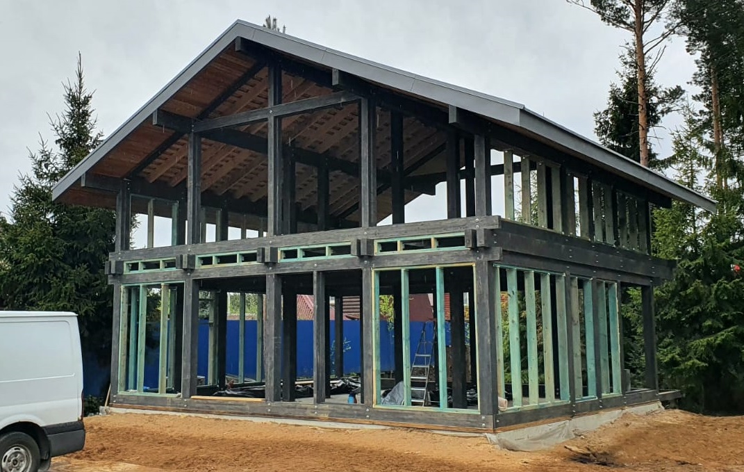Силовой каркас фахверкового дома – это прочный и надежный остов сооружения, состоящий из вертикальных (колонн) и (горизонтальных) элементов соединенных между собой.Материал несущей конструкции – конструкционный клееный брус изготавливается из северных хвойных пород. Его преимущества вы можете прочитать в статье “Достоинства северного леса”.Все детали будущего домокомплекта изготавливаются на высокоточном оборудовании. На этом этапе вырезаются места соединения колонн и балок, и пазы под остекление, после чего брус шлифуется, покрывается антисептическим раствором, маркируется и формируется в пачки.На стройплощадку приходит домокомплект заводского изготовления с запилом в чашу. Дом собирается, как конструктор, из готовых деталей, при этом необходимо не только установить все детали на свои места, но и соблюсти правильный порядок установки, произвести несколько этапов затяжки шпилек и выполнить дополнительный крепеж ответственных узлов. У каждой компании свои особенности сборки. Огромный опыт строительства позволил создать нам систему сборки с кратчайшими сроками (возведение силового каркаса проекта Ф-114 в условиях хорошей погоды занимает всего 3 дня, а монтаж теплового контура 20 дней).